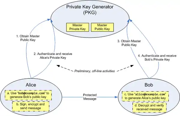 Identity-based systems allow any party to generate a public key from a known identity value such as an ASCII string. A trusted third party, called the Private Key Generator (PKG), generates the corresponding private keys. To operate, the PKG first publishes a master public key, and retains the corresponding master private key (referred to as master key). Given the master public key, any party can compute a public key corresponding to the identity by combining the master public key with the identity value. To obtain a corresponding private key, the party authorized to use the identity ID contacts the PKG, which uses the master private key to generate the private key for identity ID.