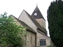 The name Ifield is derived from "Yew-field". There were many Yew trees in the parish, and some can be seen in the churchyard of St Margaret's Church. Ifield contains some of the most historic parts of Crawley, and there is a mention in the Domesday Book: "it is and was worth 20 shillings", where Ifield was spelt Ifelt.[2] Locally there is much evidence of Saxon iron works and a stretch of Roman Road still exists today known locally as the "Quarter Mile".[3] St Margaret's Church was built in the 13th century. It contains both the grave of Mark Lemon (the first editor of Punch), and the Holles family vault. Adjacent to St Margaret's Church is the Ifield Barn Theatre. The old parish of Ifield contained most of the western part of modern-day Crawley, and the old village is on the very western edge of the new town. As well as containing two modern churches - St.Leonards in Langley Green and St.Albans in Gossops Green - Ifield Parish also contains a Friends' Meeting House. Founded in 1676 it was the first purpose-built meeting place for the Quakers anywhere in the world.[3] A V-1 flying bomb landed in Ifield during World War II. It damaged the village school and wounded one local man who remained slightly brain damaged for the rest of his life.