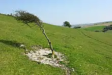 The Downs to the west of Iford are impressive. It is the most treeless part of our Downs without the deep-cut bostals (tracks) visible in other parts, as medieval traders and herders descended these slopes comparatively rarely. At the top of the scarp in this area are three hills: Front Hill, Iford Hill and Swanborough Hill. Across the ridge is the line of the South Downs Way.Unfortunately despite passing close to the designated Iford Hill slopes, it does not actually pass ancient Downland pasture, nor benefit from the flowers and wildlife that survives off it. Three ancient barrow clusters have also been lost to the plough on Front Hill.[9]