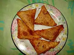In Bangladesh, a wide variety of foods is prepared to break the fast at Maghrib time. Some of the common iftar items from Bangladeshi cuisine include piyaju (made of lentil paste, chopped onions and green chillies, like falafel), beguni (made of thin slices of eggplant dipped in a thin batter of gram flour), jilapi, muri, haleem, dates, samosas, dal puri (a type of lentil-based savoury pastry), chola (cooked Bengal gram ), kebab, mughlai porota (stuffed porota with minced meat, eggs and spices), variety of pitha, aloo chop, singara, ghugni, amerti, bundia, nimki, Pakora, khaja, batasa, khabar tula, Bengali sweets, Roasted chickpeas and different types of fruits such as watermelon, apple, banana, papaya, pear, mango and pineapple. Bengalis break their fast with all their friends and family and eat together in a banquet with their array of food; however, savoury items are eaten before the sweet.[7]