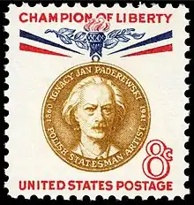 On 8 October 1960, the United States Post Office Department released two stamps commemorating Ignacy Jan Paderewski.[58] Poland also honored him with postage stamps on at least three occasions.