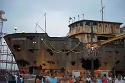 A little less than seventy years later, this great ship washed up on the beach right outside of Morey's Pier. In the first few months of operation the park had a "live press conference" announcing the refurbishment of the ship. This so-called refurbishment is called into doubt immediately as the ship has huge gashes ripped into the metal. Throughout the performance it was established that the restoration of this ship was questionable due in part to the strange Captain. The presence of NAPS (the North Atlantic Paranormal Society) cast further doubt upon the legitimacy of this ship's renovations. Through a few more dialog bits, the presence of toxic and nuclear wastes is revealed, and according to NAPS, top secret atomic experiments were taken aboard. The Captain then invites guests to tour his vessel before the re-launching celebration. While in line, tension builds as the ship is heard groaning and creaking. Once in the ride it is clear that the undead Capitan has double crossed his guests and now they must find their way out of the ship. As the story unfolds, it seems that the wastes have had a bigger part to play in the original mystery. The combined effects of the wastes have caused the original crew to mutate into either fully dead or half-dead monstrosities, effectively trapping their souls on this barge forever. Visitors will be forced to walk through many rooms such as the crew quarters and the communications room, while being victims of a spectral onslaught.