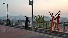 The region at the foot of Naksan Park is a preamble to the mural village with its steel art structures. The park was established in 2002 to increase green areas in the region and restore the historical site, as much of the mountain area was destroyed during the Japanese colonial era and again during re-development projects of the 1960s. It is one of the most popular photo spots,[9] and sculptures include a gentleman and dog walking towards the sky and a couple holding hands and looking at each other.[12]