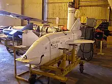 A variant fitted to the British Royal Navy's Leander-class frigates differed in several respects from the original Australian version designed to operate in the Pacific. The Royal Navy required changes to the frequencies used in order to enable Ikara to be used in the NATO area, where different electronic warfare conditions and international frequency agreements had to be taken into account. Neither the Australian-built analogue computer system, nor the American Bunker Ramo Corporation 133 digital computer system, used in most RAN systems, were compatible with the ADA digital battle-control computers being fitted into Royal Navy ships, and this was also changed. The UK-manufactured version of the Mark 44 torpedo also differed from the US-built version purchased by the Australians for their Ikara missiles. The British also required the missile payload to be changeable aboard ship to permit different payload combinations to be used, including a nuclear depth bomb (NDB) option, and this, together with the different internal ship layouts required further changes to the missile, storage and handling arrangements. The Australian practice was to combine the missile and payload at a shore-based ordnance facility and issuing the complete unit to a ship; repair or maintenance was only possible ashore. In the British ships, the changes made enabled a faulty torpedo on a missile in working order to be replaced, increasing the flexibility of use of very limited stocks aboard; especially on lengthy deployments around the globe, as was more common with British ships than their Australian counterparts. The facility to change a torpedo payload aboard ship also permitted a change from a conventional torpedo to a WE.177A NDB, a facility for a nuclear option that was not needed on ships fitted with the Australian variant of Ikara.[5] The British launcher also differed, covered by a zareba (breakwater) when not in use to prevent icing in northern waters, and extremely accurate in training in bearing. It was also notoriously noisy.