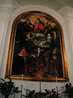 The painting presents itself as a Last Judgement scene with ten main characters, including Gesualdo and his second wife. The prince is supplicating Christ by the side of his maternal uncle, St. Charles Borromeo, who is clothed in cardinal red and positioned as his protector.[8]