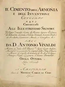 Il Cimento dell′ Armonia e dell′ Inventione (The Contest Between Harmony and Invention) is a set of twelve concertos written by Antonio Vivaldi and published in 1725 as Op. 8. All are for violin solo, strings and basso continuo. The first four, which date back to 1718–23, are called The Four Seasons (Le quattro stagioni). The set was published in the Amsterdam workshop of Michel-Charles Le Cène and dedicated to Wenceslas, Count of Morzin,[1] an advisor to Charles VI, Holy Roman Emperor (not to be confused with Karl Joseph, Count Morzin, benefactor of Joseph Haydn).