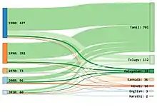 A graphical representation of the decadal split of a fairly accurate picture of the number of films Ilaiyaraaja has worked on vs the languages he has worked in