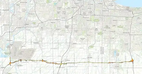 The Illiana Expressway, also known as the Illiana Corridor, was a controversial proposed toll road in northeastern Illinois and northwestern Indiana. Formal environmental impact statement studies were begun in April 2011 and were led jointly by the Illinois Department of Transportation (IDOT) and Indiana Department of Transportation (INDOT). It was planned as being approximately 50 miles (80 km) in length, mostly in Illinois, connecting Interstate 55 (I-55) in Illinois to I-65 in Indiana. The freeway was scheduled to open in 2018.[1] However, construction plans were shelved in 2015 when Illinois Governor Bruce Rauner issued an executive order delaying the construction of new highways in the state.[2]