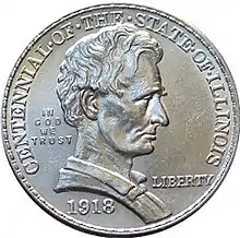 The Illinois Centennial half dollar is a commemorative 50-cent piece struck by the United States Bureau of the Mint in 1918. The obverse, depicting Abraham Lincoln, was designed by Chief Engraver George T. Morgan; the reverse, based on the Seal of Illinois, was by his assistant and successor, John R. Sinnock. Morgan's obverse is based on the statue by Andrew O'Connor.