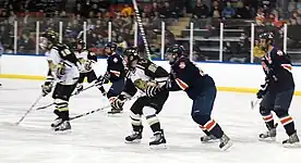The Illinois Fighting Illini men's ice hockey team is a college ice hockey program that represents the University of Illinois at Urbana–Champaign. The Illini play on campus at historic[2] 1,500-seat University of Illinois Ice Arena.[3] They are a member of the American Collegiate Hockey Association (ACHA) at the ACHA Division I level.[4] The team is a member of the Central States Collegiate Hockey League (CSCHL) within the ACHA. The team operates as a registered student organization (RSO) at the University of Illinois. The University does not currently have an NCAA varsity team, and thus the club team is the highest level of hockey offered by the University.[5] A feasibility study published in March 2018, and commissioned by the NHL, NHLPA, and College Hockey, Inc., found a high probability of success for the hockey program to transition to NCAA Division I. [6][7] Illinois however reversed course in May 2022, announcing that they were no longer exploring adding a varsity hockey program. [8]
