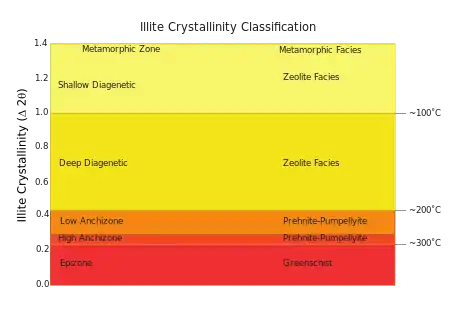 X-Ray diffraction plots provide information on angles and intensities of refracted beams which allow scientists to construct a 3D model of the crystalline structure. The focus of an illite crystallinity XRD plot is the main peak. Width of the peak at one half of its height is measured and this angle (recorded with units of ∆ °2θ),[1] can be plotted on a chart with metamorphic zones and facies like the one in figure 1. If the illite crystallinity values fall in the 0-0.25 °2θ range, it corresponds with a metamorphic epizone or greenschist facies. If the illite crystallinity values fall in the 0.25-0.30 °2θ range, it corresponds with a metamorphic high anchizone or prehnite-pumpellyite facies. If the illite crystallinity values fall in the 0.30-0.42 °2θ range, it corresponds with a metamorphic low anchizone or prehnite-pumpellyite facies. If the illite crystallinity values fall in the 0.42-1.0 °2θ range, it corresponds with a metamorphic deep diagenetic zone or zeolite facies. If the illite crystallinity is > 1.0, it corresponds with a metamorphic shallow diagenetic zone or zeolite facies.[1]