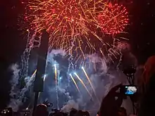 Similar to the 25th and 30th anniversaries, IllumiNations had a one-day-only tag commemorating Epcot's 35th anniversary after the normal IllumiNations show on October 1, 2017.[33] The show included the same music as the 25th and 30th anniversary tags, as well as fireworks from the extra barges.[34]