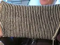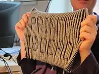Illusion knitting or shadow knitting is a form of textile art, in which the knitting is viewed as simply narrow stripes from one angle, and as an image when viewed from another angle.[1] Illusion knitting has been recognised as an art form since 2010, largely due to the advances made by Steve Plummer who has created several large and detailed pieces. Similar effects occur in Tunisian crochet.