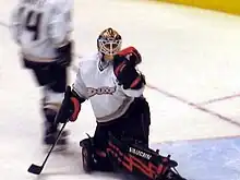 With the departure of backup Gerber, Bryzgalov took over behind Giguère in 2005–06 season. However, injuries to the Ducks starter[5][6][7] allowed Bryzgalov to play more games than he otherwise would have and he responded to the challenge with a 13–12–1 record with a 2.51 goals against average (GAA) and .910 save percentage. In the subsequent playoffs, Bryzgalov made three starts and one relief appearance for the Ducks in their first-round series against the Calgary Flames. In Game 1, he filled-in for an injured Giguère, taking a 2–1 overtime loss.[8] He relieved Giguère once more in Game 5 and stopped all 19 shots he faced in a 3–2 loss.[8] He then took over the starting job for Games 6 and 7 of the series, winning 2–1 in Game 6 and recording a shutout in the decisive Game 7. Moving past the Flames, Bryzgalov then recorded 5–0 and 3–0 shutouts in the first two games of the second series against the Colorado Avalanche for three consecutive shutouts. He tied Frank McCool's 1945 playoff record for most consecutive shutouts by a rookie and passed Giguère, who had recorded consecutive shutouts in 2003 for the third-longest playoff shutout streak of all time.[9] Despite his success in the first two rounds, Bryzgalov struggled in the semifinals against the Edmonton Oilers and was eventually replaced by Giguère for the rest of the series as the Ducks were eliminated in five games.