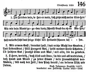 Thirdly, during the Reformation, the Nunc dimittis was used as a prayer of thanks after communion, as documented in a Nördlingen liturgy of 1522 and a Strasbourg liturgy of 1524, the latter specifically calling for its use "after the meal" or communion ("nach dem Mahle").[2] The rhyming paraphrase created by Johann Englisch, or Johannes Anglicus, first appearing in 1527 on a now-lost leaflet, became a regular part of Strasbourg hymnals from 1530 on.[2] His version retains the theme of the Nunc dimittis, with its ideas of rest in peace after having seen the light of a saviour who came for all people and especially Israel.[3] The hymn is sung to a melody attributed to Wolfgang Dachstein, written before 1530.[4] It is one of three hymns described as Der Lobgesang Simeonis (Simeon's song of praise) appearing in an 1848 collection of Schatz des evangelischen Kirchengesangs im ersten Jahrhundert der Reformation ("Treasure of Protestant church singing in the first century of the reformation"). The first two are the Biblical canticle in Martin Luther's translation, and Luther's paraphrase "Mit Fried und Freud ich fahr dahin", followed by "Im Frieden dein". A footnote marks the three songs as also suitable for funerals.[5]