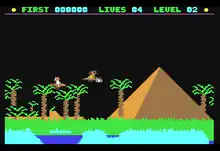 Imhotep is a scrolling shooter similar to Defender. In the game the title character flies on a mystic bird which uses power bolts to shoot down enemies. The player must also avoid the stones flung by catapults.[2]