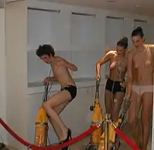 Originally conceived as an art collective in 2000, Imitation of Christ was founded by former art students Tara Subkoff and Matthew Damhave. Subkoff had dropped out of art school and had worked as an actress prior to forming the project. The project, according to Subkoff, was quickly "confused" by many to be a fashion line,[2] which led to the pair designing a total of four collections together before Damhave left the project in 2001. Named after the fifteenth-century devotional text of the same name, as well as a Psychedelic Furs song,[3] their shows were theatrical, political (one season, they demanded money from guests and donated it to charities), while simultaneously intriguing fashion editors with beautiful clothes. In its earliest forms, Subkoff appointed Chloë Sevigny as the line's creative director.[4] The exhibitions were described as guerrilla in style,[5] with their early shows being held in a funeral parlor in the Manhattan's East Village.[6] Models who wore the pieces for runway shows included actress Scarlett Johansson,[7][8] and included both men's and women's pieces.[9]