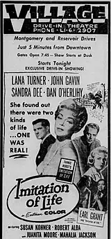 Sirk's Imitation of Life premiered in Chicago on March 17, 1959, followed by Los Angeles on March 20 and New York City on April 17.[2] Following its New York opening, it became number one in the US for two weeks[10] before Universal put the film into general release on April 30. Though it was not well-reviewed upon its original release and was viewed as inferior to the original 1934 film version – many critics derided the film as a "soap opera"[11] – Imitation of Life was the sixth highest-grossing film of 1959, grossing $6.4 million,[12] and was Universal-International's top-grossing film that year. Hiro wrote that in contrast to the novel, this film and the previous film received "far more critical attention", with the second film being "more famous" than the first.[7]