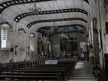 In 1870, the second and third levels of the belfry, as well as the upper level of the convent had to be demolished due to damages cause by earthquakes. A temporary chapel was built while the big church underwent repairs. In 1875, the archbishop authorized the purchase of a retablo mayor, pulpit, acheros, and other decorations for the church. Planks of narra were used for the floor of the nave, while blue and white tiles were fitted to the main altar.[2] An extension was added behind the church to serve as an antesacristy in 1878. The decorative iron grilles were put around the atrium in 1887. The camapanario was repaired in 1892 with bricks instead of stones used for the upper second and third stories.[2]