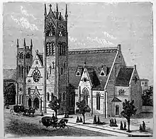 The new building was dedicated in 1875,[6] grand and exuberant, with asymmetric square towers, various groupings of lancet windows, and rose windows. The exterior was clad in carefully laid ashlar Wauwatosa limestone, with openings trimmed in red-orange and gray sandstone. The building was designed by E. Townsend Mix, Milwaukee's prominent architect at the time. The vertical emphasis seen in the towers and upward-pointing windows are characteristics of Gothic style, and the use of multiple colors makes it High Victorian Gothic. Inside, the original auditorium was "as bold and colorful as the exterior," with a nave arcade, a vaulted aisle, and "sumptuous ornament."[5]