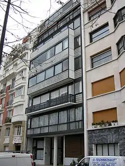 This building is probably the most traditional of Le Corbusier's mature works.[8] The design was constrained by the narrow (12 m (39 ft)) and deep (24 m (79 ft)) configuration of the site[9] and by strict zoning codes, which specified the parapet height, conformance to the existing street wall, and even the placement of the balconies and bay windows.[8] Nevertheless, the architect's inventiveness is evident in the all-glass facades. Identical on both elevations, they were inspired by Pierre Chareau and Bernard Bijvoet's Maison de Verre, but Le Corbusier departed from Chareau's glass-brick-only prototype by the addition of transparent openings. Externally the facades offer a contrast between solid glass bricks and transparent windows, but internally the apartments are flooded with light across the entire wall.[9]