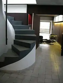 The apartment that Le Corbusier built for his personal use on the top two floors extends over 240 m2 (2,600 sq ft). It is reached by stairs from the sixth floor, the last level served by the elevator. Rooms are arranged so as to eliminate corridors and minimize the number of doors.[9] The seventh floor contains the entrance, living room, kitchen, and atelier. The eighth floor contains a guest room and access to the roof garden.[10] Walls are painted in pure primary colors. The atelier that Le Corbusier used for his painting has a wall of stone and exposed rough brick that contrasts with the modern concrete and glass materials.[8] Furnishings were designed by Le Corbusier's associate Charlotte Perriand.[11]