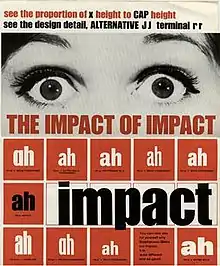 During the 1960s, there was a trend towards condensed, bold, "industrial" sans-serifs like Schmalfette Grotesk and Compacta, largely pioneered by West German magazine Twen,[1] and Impact was intended to fit this trend.[5] Writing in 2004, the year before his death, Lee explained that the design goal was "to get as much ink on paper as possible in a given size with the maximum possible x-height" and to provide a home-grown metal type alternative to European designs in the style (e.g. Schmalfette Grotesk, illustrated in Lettera, a contemporary anthology series of lettering), which were complicated for British businesses to license and use.[6][7][8][9] Lee wrote that "many of us admired the vitality and colour of what we knew only as Schmalfette, and used it by old-fashioned cut and paste. Use was limited as it was never made in metal as far as I know, and existed then in capitals and numerals only".[6] (Schmalfette Grotesk was later digitised, with an added lower-case, as Haettenschweiler by Eraman Ltd.[10]) Other designs along the same lines from around the same period included the Letraset face Compacta,[8] Matthew Carter's slightly earlier masthead of Private Eye (which is caps-only but based on a never-released typeface with a lower case),[11][12] and the phototypesetting Helvetica Compressed, also by Carter and released a few years later.[13][14]
