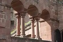 The Palas[15] is located in the northern part of the palace and attached to the ring wall with its back wall. It had a floor area of 29×15.7 m. Above a low basement is a main floor, which was accessed from the courtyard via a representative, probably two-flight, open staircase. The representative facade facing the courtyard is probably the most impressive part of the complex. It is laid out asymmetrically, offset by 1.30 m, with 3+3 window axes on the western side and five window axes on the eastern side, each of which is bound together in arcades and designed internally with double columns. Their block capitals are decorated with plant motifs. Between the double group of three and the group of five windows is the entrance portal with a clover-shaped finial, lavishly decorated with vines. The "Barbarossa's head" walled in above it was placed there later, its origin unknown. The facade of the floor above is reconstructed differently in detail: thus, a large entrance window in the dimensions of the portal below is assumed[16] or a double window.[17] Of the remaining window arrangement, it is assumed that it repeated that of the floor below.