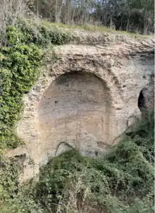 The large Roman villa was built on a massive eleven-arched cryptoporticus supporting a platform now beneath the Villa Valadier.[16] It had an agricultural area with warehouses and an olive oil mill. It was connected to the Baths at Aquae Apollinaris by a paved road.