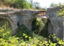 The main part of the long springhouse is a vaulted chamber 41.5 m long consisting of a main gallery of 27.5 x 1.3 m fed from the south end, and to the north a channel 14.0 m long in which the cross-section contracts.[14] At the end of the northern channel, another channel joins it with water from a rock face to the west and the total contents are fed to a steep offtake. The main source is the west wall of the main gallery where at the bottom of 13 arches built on the exposed rock face several springs issue forth. The underground arcade was replicated above ground with arches of double width covering two underground arches, but the overground structure has mainly collapsed. These were used to support the arches below and the cliff face behind, which is fragile, but also probably as a monumental feature of the aqueduct visible from the baths below.