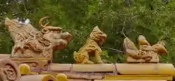 Along the ridges (unions between the roof panels), near the corner, a row of small figures is placed. These are often made of glazed ceramic and form an outward marching procession. Here we see the imperial yellow glaze reserved for the emperor. At the tail of the procession will be an imperial dragon, representing the authority of the state. At the head of the procession will be a man riding a Phoenix, one legend suggests that this represents a minion of the emperor who grew greedy for power and was hanged from the roof gable for treason. Another version of this figurine is an immortal riding a fenghuang-bird or qilin. Yet another interpretation is that this is a person serving the emperor, being watched by the following beasts. In between will be mythical beasts, usually an odd number of them. The mythical beasts are set to pounce upon the man and devour him should he stray from performing his duties with faithfulness and rectitude.