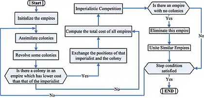Imperialistic Competition is another part of this algorithm. All the empires try to win this game and take possession of colonies of other empires. In each step of the algorithm, based on their power, all the empires have a chance to take control of one or more of the colonies of the weakest empire.[1]