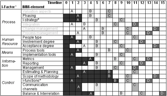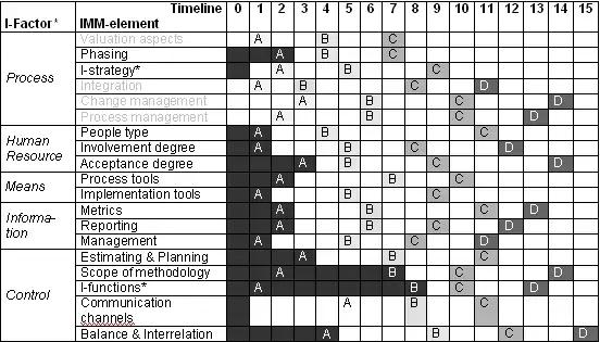 An example of an implementation maturity matrix is given below (see Figure 2). The implementation factors can be found in the first column, followed by the IMM-elements in the second one. The maturity levels belonging to the elements can be found in the cells below the timeline. This timeline does not hold any temporal meaning. It merely allows the matrix to depict empty cells between the different levels. Although these empty cells don't have particular meanings, they do illustrate the dependencies between elements and their maturity levels. Due to these dependencies and checkpoints, even if an element has almost achieved, for instance, maturity level B, it will still be assigned to level A.