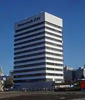 The building was first operated as the Christchurch studio for Television New Zealand (TVNZ), who displayed their logo on the building. Shows such as What Now,[7] After School,[8] Simon Barnett's quiz show Face the Music and later The Son of a Gunn Show[9] were filmed in the tower block. TVNZ vacated the building in late 1998 following a decision to move all of their Christchurch-produced shows to Wellington. In the late 1990s, Telstra New Zealand, the telecommunications company of Telstra in New Zealand, owned the naming rights to the building. After Clear Communications was acquired in December 2001 to form TelstraClear, the Clear logo was prominently displayed on the building.[10][11] The building's naming rights were sold to The Radio Network and it was renamed to Radio Network House during the ownership of Nor West Arch No.4 Ltd. At the time of demolition the logo of Newstalk ZB, a subsidiary of The Radio Network, was displayed on the building.[5]