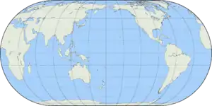 The 1602 Ricci map is a very large, 5 ft (1.52 m) high and 12 ft (3.66 m) wide, woodcut using a pseudocylindrical map projection showing China at the center of the known world.[2] The 1906 Eckert IV map resembles the display of this Chinese map. It is the first map in Chinese to show the Americas. The map's mirror image originally was carved on six large blocks of wood and then printed in brownish ink on six mulberry paper panels, similar to the making of a folding screen.