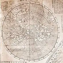 The map also incorporates an explanation of parallels and meridians, a proof that the sun is larger than the moon, a table showing the distances of planets from the earth, an explanation of the varying lengths of days and nights, and polar projections of the earth that are unusually consistent with its main map.[8]