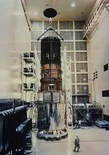 Different versions of the KH-11 vary in mass. Early KH-11s were reported to be comparable in mass to the KH-9 HEXAGON,[26] i.e. about 12,000 kg (26,000 lb). Later blocks are believed to have a mass of around 17,000 kg (37,000 lb)[27] to 19,600 kg (43,200 lb).[28][5]