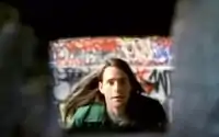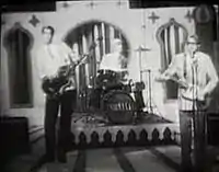 The video was filmed on old Kinescope cameras, following Cobain's request that Kerslake use authentic cameras from the period, and the band's performance was improvised.[27] The satirical tone was a result of Cobain being "so tired for the last year of people taking us so seriously . . . I wanted to fuck off and show them that we have a humorous side to us".[28] The video begins with an unnamed variety show host, played by Doug Llewelyn, former host of American reality show The People's Court, introducing Nirvana to an in-studio crowd of young fans, whose screaming is heard throughout the duration of the song. The band members, whom the host refers to as "thoroughly all right and decent fellas," perform dressed in suits, while Cobain wears glasses that made him dizzy.[29] As Cobain explained in a 1992 Melody Maker interview, "We wanted to be like The Beatles – no, The Dave Clark Five, I was wearing glasses – we would never make fun of The Beatles."[30][31] Novoselic had cut his hair short for the video, and liked it so much he kept it that way afterwards.[29] As the song progresses, the band members destroy their instruments and the set.