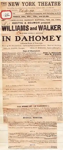 In Dahomey: A Negro Musical Comedy is a landmark 1903 American musical comedy described by theatre historian Gerald Bordman as "the first full-length musical written and played by blacks to be performed at a major Broadway house."[2] It features music by Will Marion Cook, book by Jesse A. Shipp, and lyrics by poet Paul Laurence Dunbar.[3] It was written by Jesse A. Shipp as a satire on the American Colonization Society's back-to-Africa movement of the earlier nineteenth century.