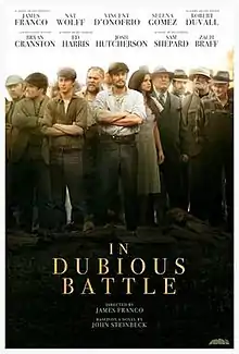 In Dubious Battle is a 2016 drama film directed and produced by James Franco, loosely based on John Steinbeck's 1936 novel of the same name, with a screenplay by Matt Rager. The film features an ensemble cast, consisting of Franco, Nat Wolff, Josh Hutcherson, Vincent D'Onofrio, Robert Duvall, Selena Gomez, Keegan Allen and Ed Harris. The film had its world premiere at the Venice Film Festival on September 3, 2016.[3]