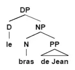 Inalienable possession constructions involve two nouns or nominals: the possessor and the possessee. Together, they form a unit, the determiner phrase (DP), in which the possessor nominal may occur either before the possessee (prenominal) or after its possessee (postnominal), depending on the language.[16] French, for example, can use a postnominal possessor (the possessor (of) Jean occurs after the possessee the arm):