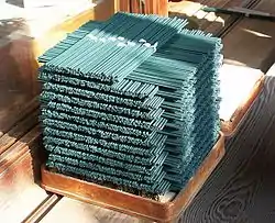 Traditionally, the bamboo core of cored stick incense is prepared by hand from Phyllostachys heterocycla cv. pubescens since this species produces thick wood and easily burns to ashes in the incense stick.[27] In a process known as "splitting the foot of the incense stick", the bamboo is trimmed to length, soaked, peeled, and split in halves until the thin sticks of bamboo have square cross sections of less than 3mm.[28][29] This process has been largely replaced by machines in modern incense production.[30]