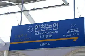 It was called "Nonhyeon Curtilage (Korean Hangul: 논현택지, Hanja: 論峴宅地, RR: Nonhyeontaekji, MR: Nonhyŏnt'aekchi) Station" tentatively, but Korail decided its official name "Incheon Nonhyeon Station" and announced it on 15 May 2012.[2]