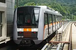 The ITC Line2 is a driverless, fully automatic subway system. The line uses 37 two-car trains, all of which were built in 2013 by Hyundai Rotem, a member of Hyundai Motor Group.[4][5] They are similar to the Canada Line cars in Vancouver, Canada, albeit using the narrow light metro body (2.65 m (8 ft 8 in)) and external sliding doors as opposed to the heavy metro wide body 3 m (9 ft 10 in) and pocket doors, and using a bottom contact third rail instead of the North American top contact.