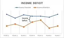 Income deficit is the difference between a single person or family's income and its poverty threshold or poverty line, when the former is exceeded by the latter.[1] Data on the income deficits of various members of a population allow for the construction of one type of measurement of income inequality in that population. Individuals or families that fall below the line are considered to be in poverty whereas families that fall above are not.[2] The income deficit is one of two measures that are used to determine a person or family's income distance from the poverty threshold, the other being a ratio rather than a difference.