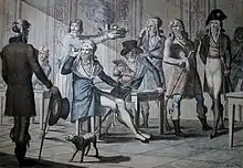 Many public balls were bals des victimes at which young aristocrats who had lost loved ones to the guillotine danced in mourning dress or wore black armbands, greeting one another with violent movements of the head as if in decapitation.[n 2] A ball held at the Hôtel Thellusson on the rue de Provence in the 9th arrondissement of Paris restricted its guest list to the grown children of the guillotined.[2]
