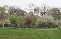 The district also purchased adjacent properties in 1929, expanding the park to 7.86 acres (3.18 ha). Eight of the nine houses that they acquired were demolished; one remaining bungalow was converted to the Women's Club House. The bungalow, designed by Benedict J. Bruns, had been built in 1920 for produce wholesaler John Luttrell Coppersmith. Coppersmith sold the house to Henry Dick, a vice president at men's clothing firm Hart, Schaffner & Marx.[2]