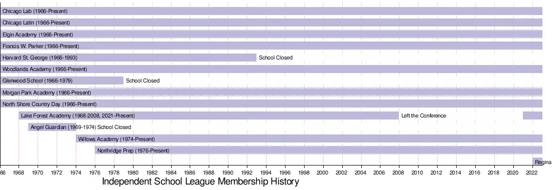 The ISL was founded in 1967.[12] The league initially comprised eight teams: Chicago Lab, Elgin Academy, Latin, Morgan Park Academy, North Shore, Francis W. Parker, and the no longer existent Glenwood School in Glenwood, Illinois (which closed its high school in 1979) and Harvard-St. George High School in the Hyde Park neighborhood of Chicago. Lake Forest Academy left the ISL in 2008 and rejoined in 2021.[13] Regina Dominican High School joined in 2022.[14]