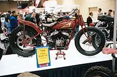 Designed by Charles B. Franklin,[1][3] the Scout was introduced in October 1919 as a 1920 model. The Scout had a sidevalve V-twin engine with its transmission bolted to the engine casing, allowing a geared primary drive - the only American v-twin to use this maintenance-free system.[4] The Scout engine initially displaced 606 cc (37 cu in), but the engine size was increased to 745 cc (45 cu in) in 1927 in response to the popularity of the Excelsior Super X.[1][5] In early 1928, a front brake was added to the Scout.[6]