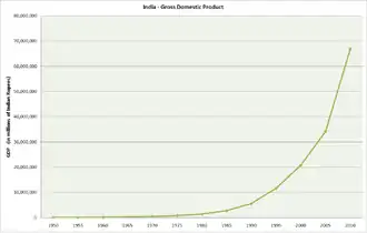 The economy of India has transitioned from a mixed planned economy to a mixed middle-income developing social market economy with notable state participation in strategic sectors.[45] It is the world's fifth-largest economy by nominal GDP and the third-largest by purchasing power parity (PPP). According to the International Monetary Fund (IMF), on a per capita income basis, India ranked 139th by GDP (nominal) and 127th by GDP (PPP).[46] From independence in 1947 until 1991, successive governments followed Soviet style planned economy and promoted protectionist economic policies, with extensive state intervention and economic regulation. This is characterised as dirigism, in the form of the Licence Raj.[47][48] The end of the Cold War and an acute balance of payments crisis in 1991 led to the adoption of a broad economic liberalisation in India.[49][50] Since the start of the 21st century, annual average GDP growth has been 6% to 7%.[45] The economy of the Indian subcontinent was the largest in the world for most of recorded history up until the onset of colonialism in early 19th century.[51][52][53] India account for 7.2% of global economy in 2022 in PPP terms, and around 3.4% in nominal terms in 2022.[54][55]